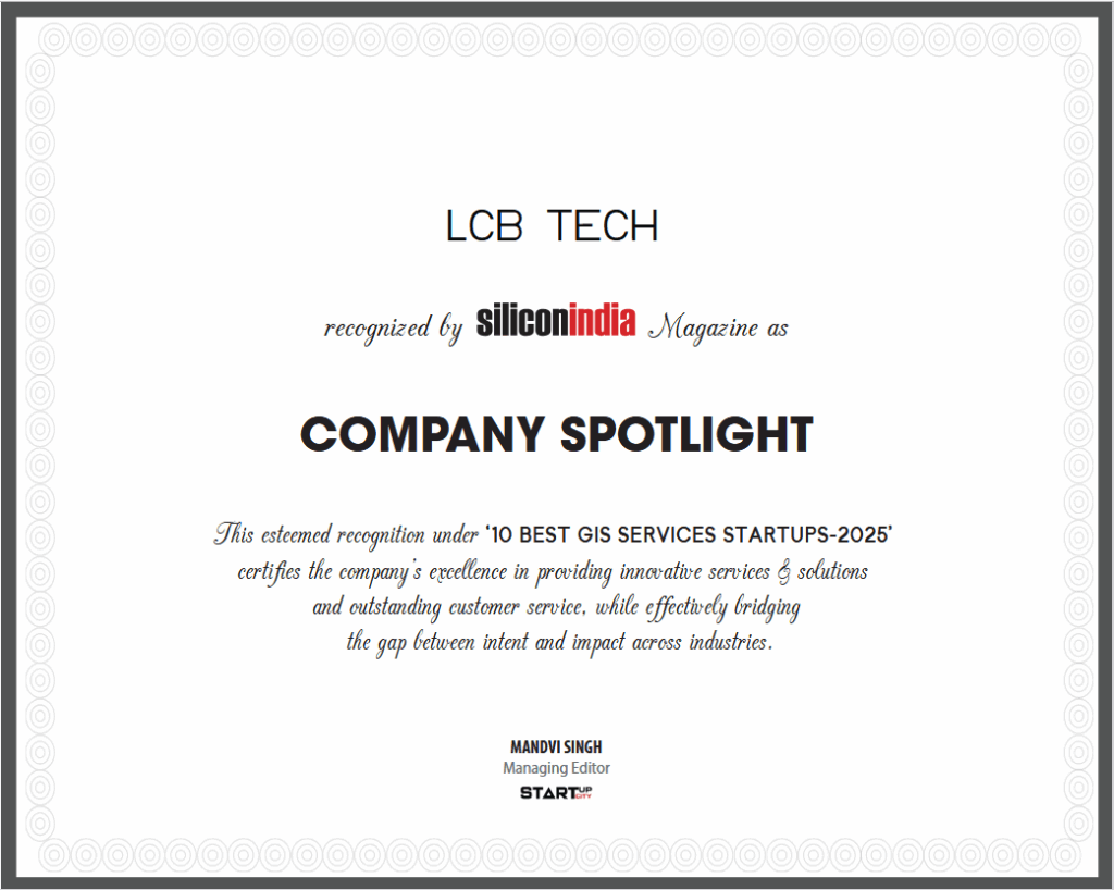 We are proud to share that LCB Tech LLP has been featured in the August 2025 issue of Silicon India Startup City Magazine under the prestigious “Company Spotlight” section, recognized as one of India’s Top Startups in GIS Services.
